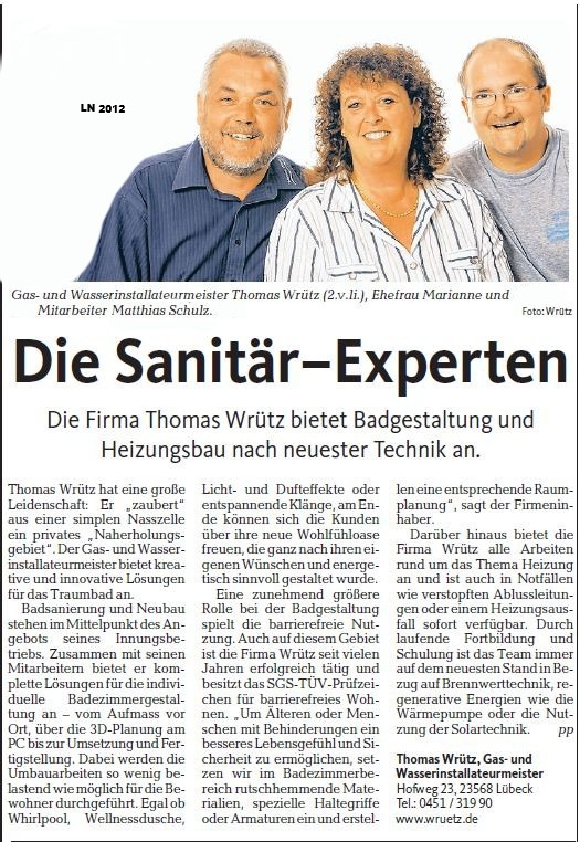 Thomas Wrütz ist Ihr traditioneller Handwerksbetrieb seit 1990 in Lübeck, der mit viel Sorgfalt Ihre Gas- und Wasserinstallationen übernimmt. Bei uns erhalten Sie eine umfassende Beratung, hochwertige Arbeit unseres Meisterbetriebs, durchgehende Betreuung und umfangreichen Service - auch nach Umsetzung des Projekts. Wir sind persönlich für Sie da, auch außerhalb der üblichen Öffnungszeiten.
